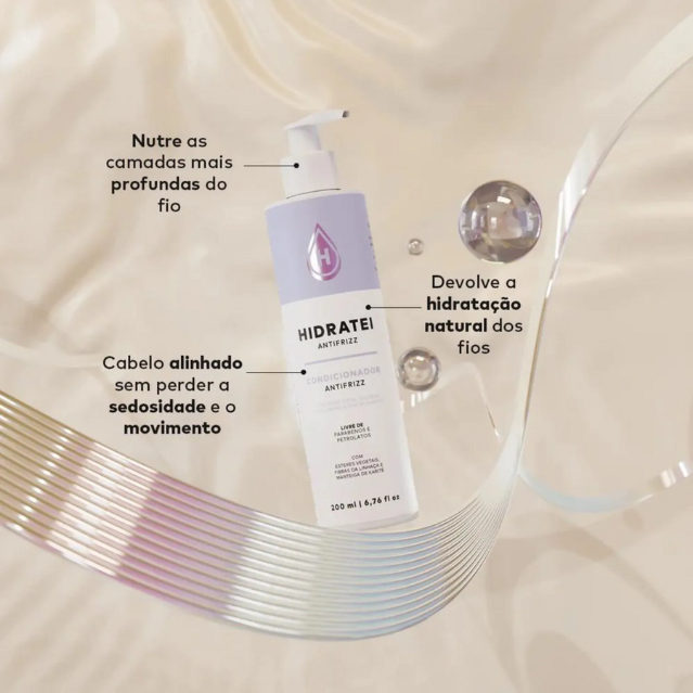 O Condicionador Hidratei Antifrizz conta com propriedades que ajudam no combate do frizz, fecham as cutículas do cabelo, deixando as madeixas alinhadas, sedosas e com movimento.