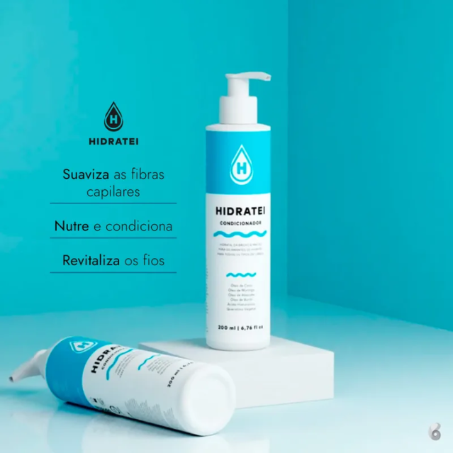 Hidratei – Condicionador 200ml: hidrata profundamente, sela as cutículas e suaviza as fibras capilares, promovendo saúde completa aos fios.
